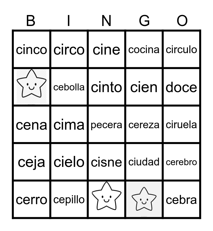 This bingo card has 3 images and 22 words: cielo, cinto, cerro, circulo, cinco, circo, cereza, cisne, cien, cena, ciudad, cerebro, cebolla, cebra, ciruela, cine, doce, cima, pecera, cepillo, ceja and cocina.