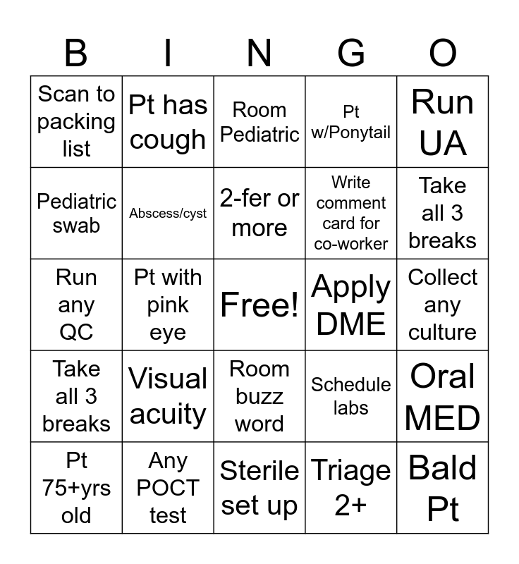 This bingo card has a free space and 44 words: Room ear pain, Bald Pt, Room WC, Pt 75+yrs old, Turn in 5 bins, Triage 2+, Room Pediatric, Blood draw, Run UA, Any POCT test, Pt w/Ponytail, Apply DME, Room buzz word, Visual acuity, Pt states "That's high for me", Sterile set up, Pregnancy test, Run any QC, Any Injection, Take all 3 breaks, Pt has cough, Nurse visit, Pt has red hair, Scan to packing list, Schedule XRAY, Collect any culture, Ear pain/fullness, Splint, Schedule labs, Take all 3 breaks, Answer phone, Oral MED, Rectal problem, (Any or all) Clean instruments, run autoclave or check BI, Pt with pink eye, Any abnormal POCT result, Vaginal swabs, Abdominal pain, 2-fer or more, Pediatric swab, Write comment card for co-worker, Call ED, Abscess/cyst and EKG.
