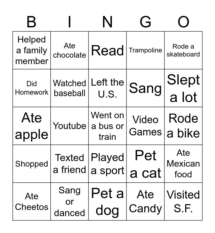 This bingo card has a free space and 29 words: Ate Cheetos, Rode a bike, Youtube, T.V., Helped a family member, Read, Watched baseball, Texted a friend, Video Games, Sang or danced, Rode a bike, Visited S.F., Pet a dog, Ate Candy, Slept a lot, Left Cali, Played a sport, Shopped, Rode a skateboard, Ate apple, Pet a cat, Visited Santa Rosa, Sang, Did Homework, Trampoline, Ate chocolate, Ate Mexican food, Left the U.S. and Danced.