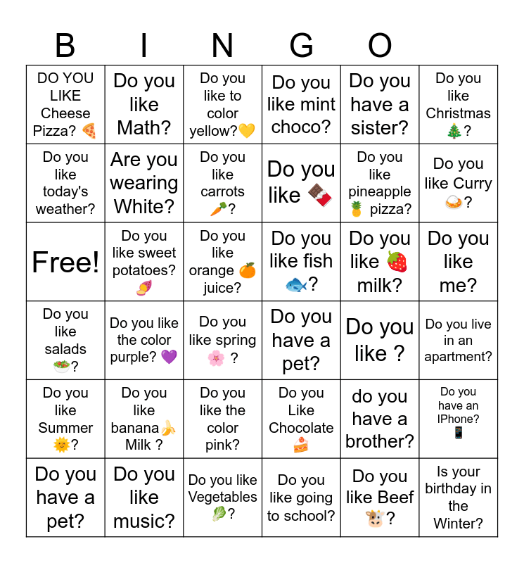 This bingo card has 36 words: Do you Like Chocolate ๐ฐ, Do you like the color pink?, Do you like going to school?, Do you like today's weather?, Do you like salads ๐ฅ?, Do you like fish ๐?, Are you wearing White?, Do you like Vegetables ๐ฅฌ?, Do you have a sister?, do you have a brother?, Do you like Curry ๐?, Do you like mint choco?, Do you have an IPhone? ๐ฑ, Do you like sweet potatoes?๐ , Do you like ๐ซ, DO YOU LIKE Cheese Pizza? ๐, Do you like Summer ๐?, Do you like ๐ milk?, Free!, Do you like to color yellow?๐, Do you like orange ๐ juice?, Do you like the color purple? ๐, Do you have a pet?, Do you like spring ๐ธ ?, Do you like ?, Do you like Math?, Do you like pineapple ๐ pizza?, Do you like music?, Do you like carrots ๐ฅ?, Do you like Christmas ๐?, Is your birthday in the Winter?, Do you have a pet?, Do you live in an apartment?, Do you like me?, Do you like banana๐Milk ? and Do you like Beef ๐ฎ?.