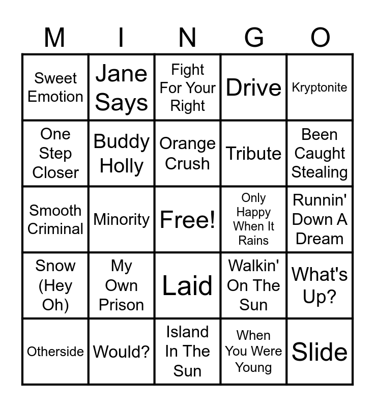 This bingo card has a free space and 30 words: Would?, Heart-Shaped Box, Minority, Give It Away, Sweet Emotion, Fight For Your Right, Buddy Holly, Laid, Only Happy When It Rains, Island In The Sun, Runnin' Down A Dream, Slide, When You Were Young, One Headlight, Been Caught Stealing, Wannabe, Walkin' On The Sun, Snow (Hey Oh), My Own Prison, Kryptonite, Smooth Criminal, All I Wanna Do, Jane Says, Tribute, One Step Closer, Drive, What's Up?, Otherside, Orange Crush and Vertigo.