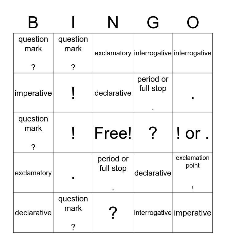 This bingo card has a free space and 26 words: period or full stop ., interrogative, declarative, question mark ?, interrogative, question mark ?, imperative, question mark ?, ! or ., declarative, period or full stop ., question mark ?, exclamation point !, declarative, !, interrogative, interrogative, exclamatory, exclamatory, imperative, ., ?, ?, ., ! and period or full stop.