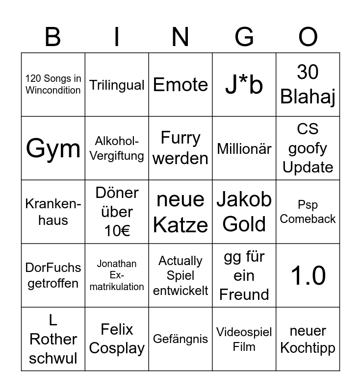 This bingo card has 25 words: Jonathan Ex-matrikulation, Gefängnis, Furry werden, L Rother schwul, 30 Blahaj, 120 Songs in Wincondition, Gym, Trilingual, Jakob Gold, Actually Spiel entwickelt, Millionär, Kranken-haus, gg für ein Freund, 1.0, Alkohol- Vergiftung, neuer Kochtipp, Psp Comeback, Emote, CS goofy Update, Döner über 10€, neue Katze, Felix Cosplay, DorFuchs getroffen, J*b and Videospiel Film.