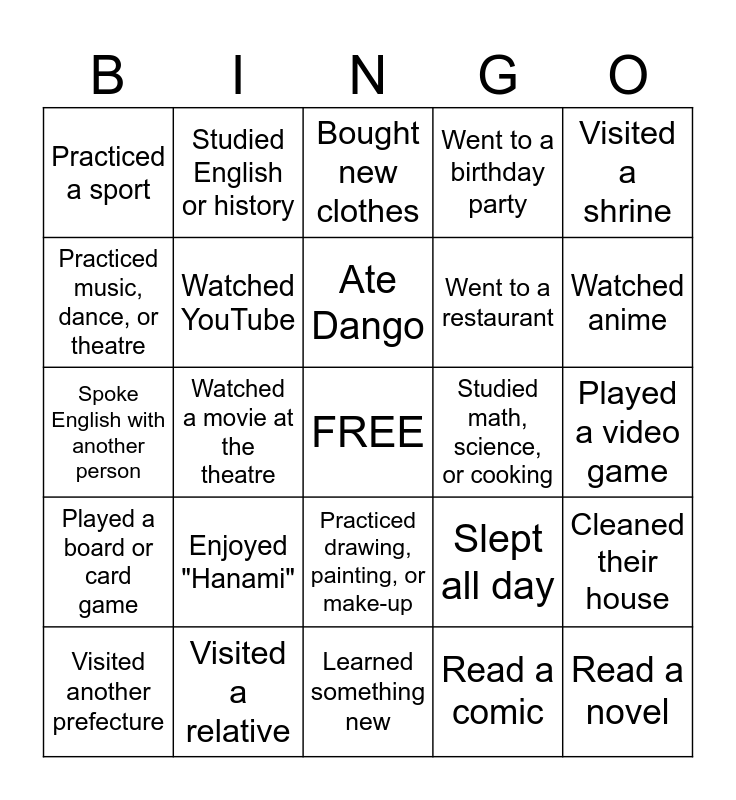 This bingo card has a free space and 24 words: Enjoyed "Hanami", Visited a relative, Ate Dango, Visited another prefecture, Visited a shrine, Practiced a sport, Practiced music, dance, or theatre, Studied English or history, Studied math, science, or cooking, Practiced drawing, painting, or make-up, Went to a restaurant, Spoke English with another person, Slept all day, Cleaned their house, Watched YouTube, Read a comic, Played a video game, Bought new clothes, Watched anime, Watched a movie at the theatre, Read a novel, Played a board or card game, Went to a birthday party and Learned something new.