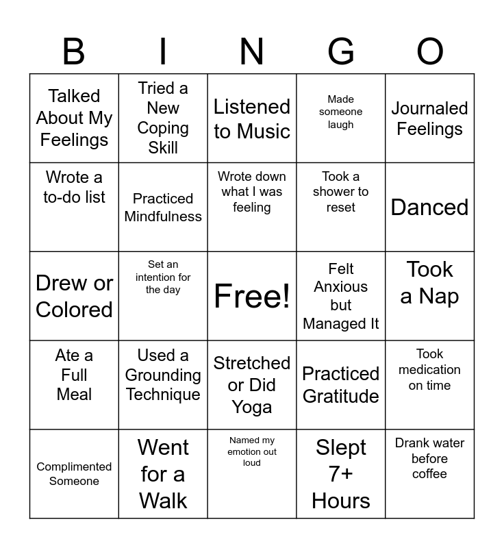 This bingo card has a free space and 34 words: Said Something Positive to Myself, Slept 7+ Hours, Avoided Negative Self-Talk, Drank Water Today, Ate a Full Meal, Practiced Mindfulness, Journaled Feelings, Complimented Someone, Tried a New Coping Skill, Took a Deep Breath, Wrote down what I was feeling, Listened to Music, Smiled at Someone, Asked for Help, Felt Anxious but Managed It, Danced, Went for a Walk, Drew or Colored, Used a Grounding Technique, Practiced Gratitude, Stretched or Did Yoga, Talked to a Friend, Talked About My Feelings, Took a Nap, Named my emotion out loud, Drank water before coffee, Made someone laugh, Joined a group conversation, Took a shower to reset, Wrote a to-do list, Ate without distractions, Set an intention for the day, Took medication on time and Celebrated a small win.
