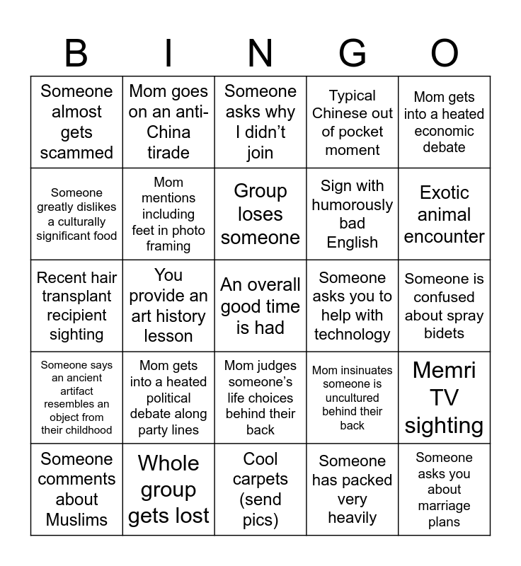 This bingo card has a free space and 24 words: Mom gets into a heated political debate along party lines, Whole group gets lost, Group loses someone, Someone comments about Muslims, Mom gets into a heated economic debate, Someone almost gets scammed, Someone greatly dislikes a culturally significant food, Mom goes on an anti-China tirade, Someone asks you to help with technology, Mom judges someone’s life choices behind their back, Sign with humorously bad English, Recent hair transplant recipient sighting, Mom insinuates someone is uncultured behind their back, Memri TV sighting, Mom mentions including feet in photo framing, Someone has packed very heavily, Someone is confused about spray bidets, Someone asks why I didn’t join, Exotic animal encounter, You provide an art history lesson, Someone asks you about marriage plans, Someone says an ancient artifact resembles an object from their childhood, Typical Chinese out of pocket moment and Cool carpets (send pics).
