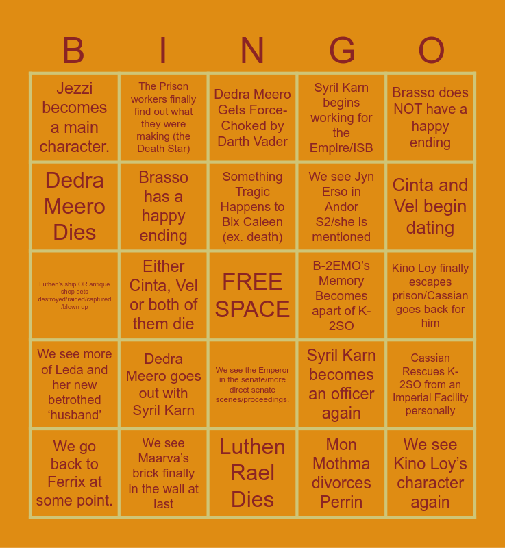 This bingo card has a free space and 24 words: Dedra Meero goes out with Syril Karn, We see Maarva’s brick finally in the wall at last, Something Tragic Happens to Bix Caleen (ex. death), We go back to Ferrix at some point., Brasso does NOT have a happy ending, Jezzi becomes a main character., Dedra Meero Dies, The Prison workers finally find out what they were making (the Death Star), B-2EMO’s Memory Becomes apart of K-2SO, We see the Emperor in the senate/more direct senate scenes/proceedings., We see Jyn Erso in Andor S2/she is mentioned, Luthen’s ship OR antique shop gets destroyed/raided/captured /blown up, Syril Karn becomes an officer again, Cassian Rescues K-2SO from an Imperial Facility personally, Brasso has a happy ending, Mon Mothma divorces Perrin, Kino Loy finally escapes prison/Cassian goes back for him, Dedra Meero Gets Force-Choked by Darth Vader, Cinta and Vel begin dating, Either Cinta, Vel or both of them die, We see Kino Loy’s character again, We see more of Leda and her new betrothed ‘husband’, Syril Karn begins working for the Empire/ISB and Luthen Rael Dies.