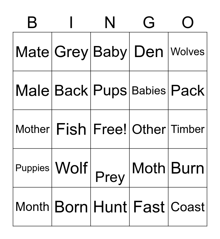 This bingo card has a free space and 24 words: Month, Wolf, Pups, Fast, Wolves, Mate, Grey, Baby, Other, Timber, Mother, Back, Moth, Burn, Male, Born, Hunt, Den, Pack, Puppies, Fish, Prey, Babies and Coast.