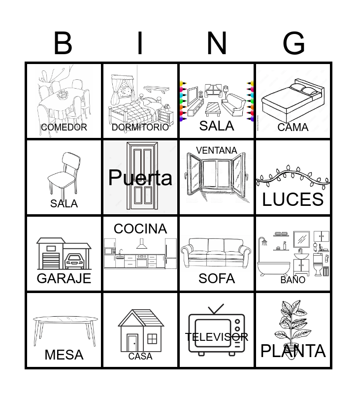 This bingo card has 16 images and 16 words: CASA, BAÑO, SALA, COMEDOR, GARAJE, DORMITORIO, SOFA, TELEVISOR, SALA, Puerta, MESA, CAMA, COCINA, LUCES, VENTANA and PLANTA.