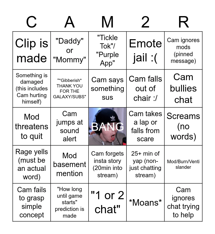 This bingo card has a free space and 37 words: Handsome orange men mentioned, Cam attempts to and fails at reading, "Can we get a timeout out on...", "*Gibberish* THANK YOU FOR THE GALAXY/SUBS", Mod/Burn/Venti slander, Mod basement mention, Cam says something sus, *immediately echos sound alert*, Cam ignores mods (pinned message), TTS made to say something unholy, Cam jumps at sound alert, Emote jail :(, Cam ignores chat trying to help, Screams (no words), Something is damaged (this includes Cam hurting himself), Rage yells (must be an actual word), Cam struggles to talk, "Tickle Tok"/ "Purple App", Cam forgets insta story (20min into stream), Cam takes a lap or falls from scare, Clip is made, Cam bullies chat, Cam fails to grasp simple concept, "1 or 2 chat", "Can we get Qs in the chat", *Moans*, "Daddy" or "Mommy", Cam gives the salad finger (Flips off camera), Full on Cam2r Crashout2r (either ends stream or game), Mod note mention, Mods crashing out bc of cam, "How long until game starts" prediction is made, Mod threatens to quit, BALL! (We love ball, someone redeems ball!), 25+ min of yap (non-just chatting stream), Cam falls out of chair :/ and Fear gas (Cam burps/almost pukes).
