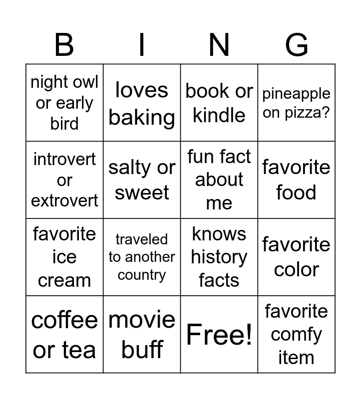 This bingo card has 17 words: Free!, coffee or tea, book or kindle, night owl or early bird, traveled to another country, pineapple on pizza?, favorite color, fun fact about me, favorite food, salty or sweet, movie buff, knows history facts, introvert or extrovert, loves baking, favorite ice cream, cook at home or take out and favorite comfy item.