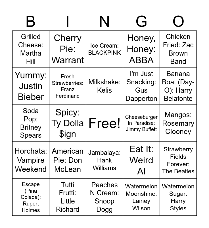 This bingo card has a free space and 53 words: Mashed Potato Time: Dee Dee Sharp, Watermelon Sugar: Harry Styles, Watermelon Crawl: Tracy Byrd, Watermelon Moonshine: Lainey Wilson, American Pie: Don McLean, Pour Some Sugar On Me: Def Leppard, Cherry Pie: Warrant, Banana Pancakes: Jack Johnson, Yummy: Justin Bieber, Vegetables (Mono): The Beach Boys, Fresh Strawberries: Franz Ferdinand, Cookie Jar: Gym Class Heroes, Strawberry Fields Forever: The Beatles, Eat It: Weird Al, Country Pie: Bob Dylan, Escape (Pina Colada): Rupert Holmes, Milkshake: Kelis, Cheeseburger In Paradise: Jimmy Buffett, Lemon Tree: Fools Garden, Chicken Fried: Zac Brown Band, Spicy: Ty Dolla $ign, Suga Suga: Baby Bash, I'm Just Snacking: Gus Dapperton, Grilled Cheese: Martha Hill, Kimchi: Formidable Vegetable, Tutti Frutti: Little Richard, Peaches: Jack Black, Eat Your Young: Hozier, Put The Lime in The Coconut: The Hit Crew, Banana Boat (Day-O): Harry Belafonte, Potato Chips: Slim Gaillard, Cheesecake: Louis Armstrong, Green Onions: Booker T & the M.G.'s, Pork and Beans: Weezer, Corn: Blake Shelton, Bon Appetit: Katy Perry, Honey, Honey: ABBA, Peaches N Cream: Snoop Dogg, Ice Cream: BLACKPINK, Butter: BTS, Hungry Eyes: Eric Carmen, Tacos, Enchiladas And Beans: Doris Day, Mangos: Rosemary Clooney, Lady Marmalade: LaBelle, Broccoli: DRAM, Jambalaya: Hank Williams, I Can't Help Myself (Sugar Pie, Honey Bunch): Four Tops, Buttered Popcorn: Diana Ross, Soda Pop: Britney Spears, Horchata: Vampire Weekend, Tangerine: Glass Animals, Peanut Butter Jelly Time: Buckwheat Boyz and I Am A Gummy Bear: Gummibar.