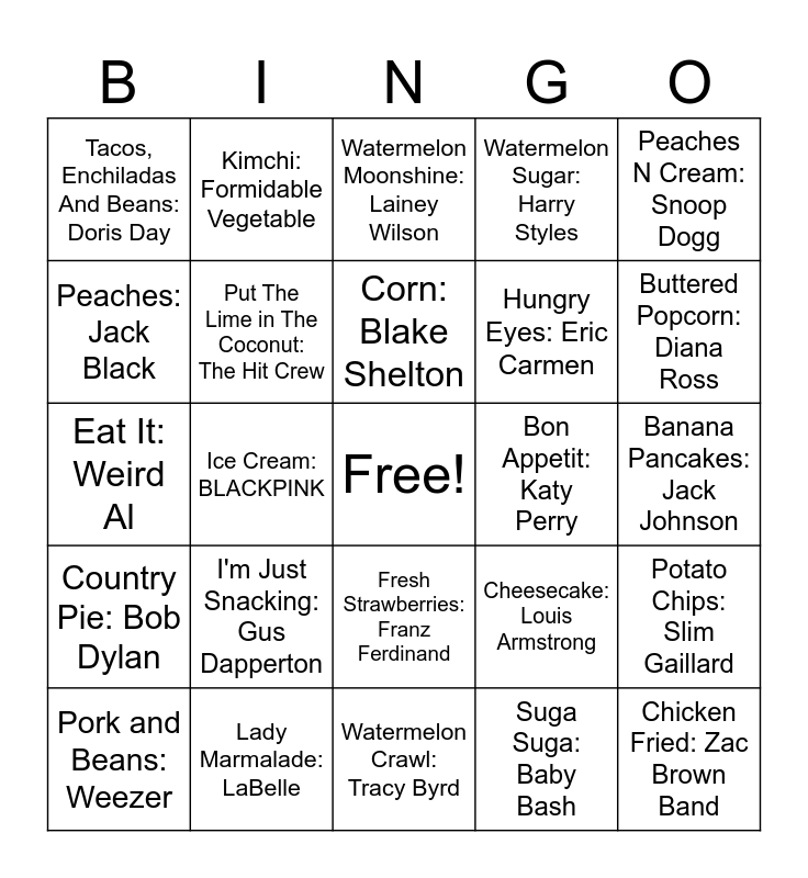 This bingo card has a free space and 53 words: Lemon Tree: Fools Garden, Chicken Fried: Zac Brown Band, Spicy: Ty Dolla $ign, Suga Suga: Baby Bash, I'm Just Snacking: Gus Dapperton, Grilled Cheese: Martha Hill, Kimchi: Formidable Vegetable, Tutti Frutti: Little Richard, Peaches: Jack Black, Eat Your Young: Hozier, Put The Lime in The Coconut: The Hit Crew, Banana Boat (Day-O): Harry Belafonte, Potato Chips: Slim Gaillard, Cheesecake: Louis Armstrong, Green Onions: Booker T & the M.G.'s, Pork and Beans: Weezer, Corn: Blake Shelton, Bon Appetit: Katy Perry, Honey, Honey: ABBA, Peaches N Cream: Snoop Dogg, Ice Cream: BLACKPINK, Butter: BTS, Hungry Eyes: Eric Carmen, Tacos, Enchiladas And Beans: Doris Day, Mangos: Rosemary Clooney, Lady Marmalade: LaBelle, Broccoli: DRAM, Jambalaya: Hank Williams, I Can't Help Myself (Sugar Pie, Honey Bunch): Four Tops, Buttered Popcorn: Diana Ross, Soda Pop: Britney Spears, Horchata: Vampire Weekend, Tangerine: Glass Animals, Peanut Butter Jelly Time: Buckwheat Boyz, I Am A Gummy Bear: Gummibar, Mashed Potato Time: Dee Dee Sharp, Watermelon Sugar: Harry Styles, Watermelon Crawl: Tracy Byrd, Watermelon Moonshine: Lainey Wilson, American Pie: Don McLean, Pour Some Sugar On Me: Def Leppard, Cherry Pie: Warrant, Banana Pancakes: Jack Johnson, Yummy: Justin Bieber, Vegetables (Mono): The Beach Boys, Fresh Strawberries: Franz Ferdinand, Cookie Jar: Gym Class Heroes, Strawberry Fields Forever: The Beatles, Eat It: Weird Al, Country Pie: Bob Dylan, Escape (Pina Colada): Rupert Holmes, Milkshake: Kelis and Cheeseburger In Paradise: Jimmy Buffett.