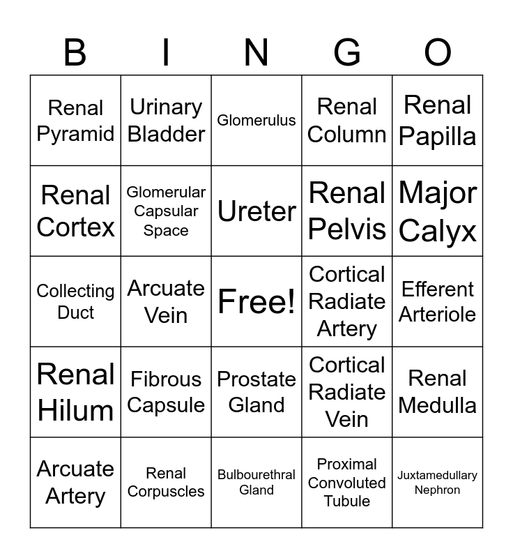 This bingo card has a free space and 24 words: Fibrous Capsule, Renal Corpuscles, Ureter, Arcuate Artery, Renal Papilla, Renal Pyramid, Renal Cortex, Urinary Bladder, Cortical Radiate Artery, Prostate Gland, Renal Pelvis, Collecting Duct, Cortical Radiate Vein, Renal Medulla, Glomerular Capsular Space, Proximal Convoluted Tubule, Efferent Arteriole, Glomerulus, Major Calyx, Arcuate Vein, Juxtamedullary Nephron, Renal Hilum, Renal Column and Bulbourethral Gland.