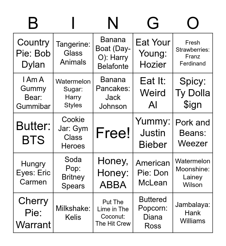 This bingo card has a free space and 53 words: Broccoli: DRAM, Jambalaya: Hank Williams, I Can't Help Myself (Sugar Pie, Honey Bunch): Four Tops, Buttered Popcorn: Diana Ross, Soda Pop: Britney Spears, Horchata: Vampire Weekend, Tangerine: Glass Animals, Peanut Butter Jelly Time: Buckwheat Boyz, I Am A Gummy Bear: Gummibar, Mashed Potato Time: Dee Dee Sharp, Watermelon Sugar: Harry Styles, Watermelon Crawl: Tracy Byrd, Watermelon Moonshine: Lainey Wilson, American Pie: Don McLean, Pour Some Sugar On Me: Def Leppard, Cherry Pie: Warrant, Banana Pancakes: Jack Johnson, Yummy: Justin Bieber, Vegetables (Mono): The Beach Boys, Fresh Strawberries: Franz Ferdinand, Cookie Jar: Gym Class Heroes, Strawberry Fields Forever: The Beatles, Eat It: Weird Al, Country Pie: Bob Dylan, Escape (Pina Colada): Rupert Holmes, Milkshake: Kelis, Cheeseburger In Paradise: Jimmy Buffett, Lemon Tree: Fools Garden, Chicken Fried: Zac Brown Band, Spicy: Ty Dolla $ign, Suga Suga: Baby Bash, I'm Just Snacking: Gus Dapperton, Grilled Cheese: Martha Hill, Kimchi: Formidable Vegetable, Tutti Frutti: Little Richard, Peaches: Jack Black, Eat Your Young: Hozier, Put The Lime in The Coconut: The Hit Crew, Banana Boat (Day-O): Harry Belafonte, Potato Chips: Slim Gaillard, Cheesecake: Louis Armstrong, Green Onions: Booker T & the M.G.'s, Pork and Beans: Weezer, Corn: Blake Shelton, Bon Appetit: Katy Perry, Honey, Honey: ABBA, Peaches N Cream: Snoop Dogg, Ice Cream: BLACKPINK, Butter: BTS, Hungry Eyes: Eric Carmen, Tacos, Enchiladas And Beans: Doris Day, Mangos: Rosemary Clooney and Lady Marmalade: LaBelle.