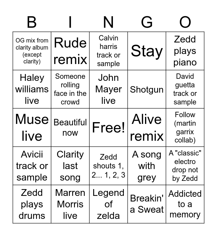 This bingo card has a free space and 24 words: Clarity last song, Marren Morris live, John Mayer live, Zedd plays drums, Zedd plays piano, OG mix from clarity album (except clarity), Haley williams live, Rude remix, Alive remix, Zedd shouts 1, 2... 1, 2, 3, Shotgun, Muse live, A song with grey, A "classic" electro drop not by Zedd, Someone rolling face in the crowd, Breakin' a Sweat, Follow (martin garrix collab), Calvin harris track or sample, David guetta track or sample, Beautiful now, Addicted to a memory, Avicii track or sample, Stay and Legend of zelda.