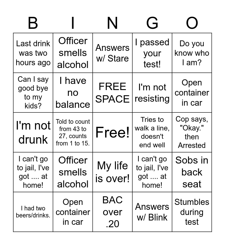 This bingo card has a free space and 75 words: Cop says, "Okay." then Arrested, Answers w/ Blink, Answers w/ Stare, Why am I arrested? x3, I know the law/my rights., You haven't read me my rights!, "Hang tight.", I want my lawyer!, I had two beers/drinks., Last drink was two hours ago, Can you just let me go home?, I have a dog at home!, FREE SPACE, Can I say good bye to my kids?, My life is over!, Told to count from 43 to 27, counts from 1 to 15., I only had 2 beers., Stumbles during test, I'm just tired., Do you know who I am?, Refuses breathalyzer, I'm not drunk, I have no balance, Officer smells alcohol, I passed your test!, Officer smells weed, I have rights!, Alphabet test given, Tries to walk a line, doesn't end well, Tries to leave, Tries to call someone, Officer stays calm, Sobs in back seat, I can't go to jail, I've got .... at home!, Open container in car, I'm not resisting, BAC over .20, BAC over .30, Cop says, "Okay." then Arrested, Answers w/ Blink, Answers w/ Stare, Why am I arrested? x3, I know the law/my rights., You haven't read me my rights!, "Hang tight.", I want my lawyer!, I had two beers/drinks., Last drink was two hours ago, Can you just let me go home?, I have a dog at home!, Can I say good bye to my kids?, My life is over!, Told to count from 43 to 27, counts from 1 to 15., I only had 2 beers., Stumbles during test, I'm just tired., Do you know who I am?, Refuses breathalyzer, I'm not drunk, I have no balance, Officer smells alcohol, I passed your test!, Officer smells weed, I have rights!, Alphabet test given, Tries to walk a line, doesn't end well, Tries to leave, Tries to call someone, Officer stays calm, Sobs in back seat, I can't go to jail, I've got .... at home!, Open container in car, I'm not resisting, BAC over .20 and BAC over .30.