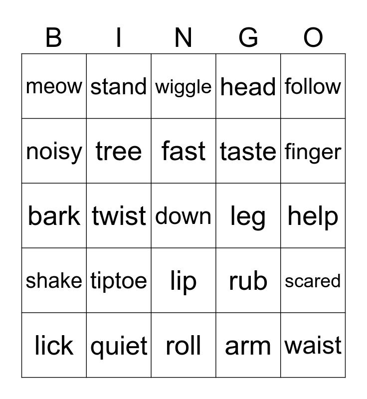 This bingo card has a free space and 24 words: tiptoe, quiet, fast, lick, follow, meow, noisy, stand, leg, lip, taste, bark, rub, scared, tree, arm, help, wiggle, finger, twist, waist, shake, head and roll.