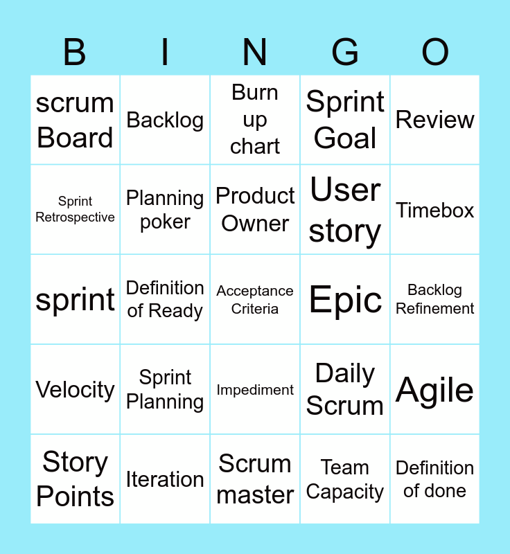 This bingo card has 25 words: Sprint Planning, Scrum master, Product Owner, Story Points, Review, scrum Board, Sprint Retrospective, Backlog, Epic, Impediment, User story, sprint, Daily Scrum, Agile, Planning poker, Definition of done, Backlog Refinement, Burn up chart, Timebox, Definition of Ready, Acceptance Criteria, Iteration, Velocity, Sprint Goal and Team Capacity.