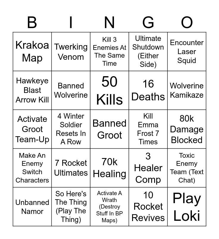 This bingo card has a free space and 24 words: 7 Rocket Ultimates, So Here's The Thing (Play The Thing), 50 Kills, Unbanned Namor, Encounter Laser Squid, Krakoa Map, Hawkeye Blast Arrow Kill, Twerking Venom, Kill Emma Frost 7 Times, 70k Healing, 16 Deaths, Activate Groot Team-Up, 3 Healer Comp, Toxic Enemy Team (Text Chat), Banned Wolverine, 10 Rocket Revives, 80k Damage Blocked, Kill 3 Enemies At The Same Time, Wolverine Kamikaze, 4 Winter Soldier Resets In A Row, Play Loki, Make An Enemy Switch Characters, Ultimate Shutdown (Either Side) and Activate A Wrath (Destroy Stuff In BP Maps).