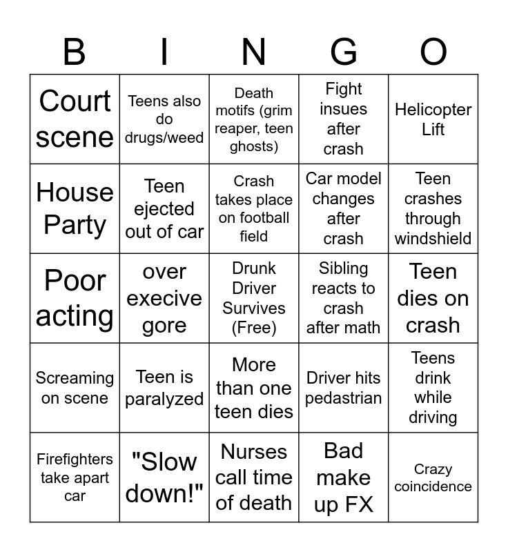 This bingo card has a free space and 24 words: Teen is paralyzed, "Slow down!", Crash takes place on football field, Firefighters take apart car, Helicopter Lift, Court scene, House Party, Teens also do drugs/weed, Sibling reacts to crash after math, More than one teen dies, Car model changes after crash, Poor acting, Driver hits pedastrian, Teens drink while driving, Teen ejected out of car, Bad make up FX, Teen dies on crash, Death motifs (grim reaper, teen ghosts), Teen crashes through windshield, over execive gore, Crazy coincidence, Screaming on scene, Fight insues after crash and Nurses call time of death.