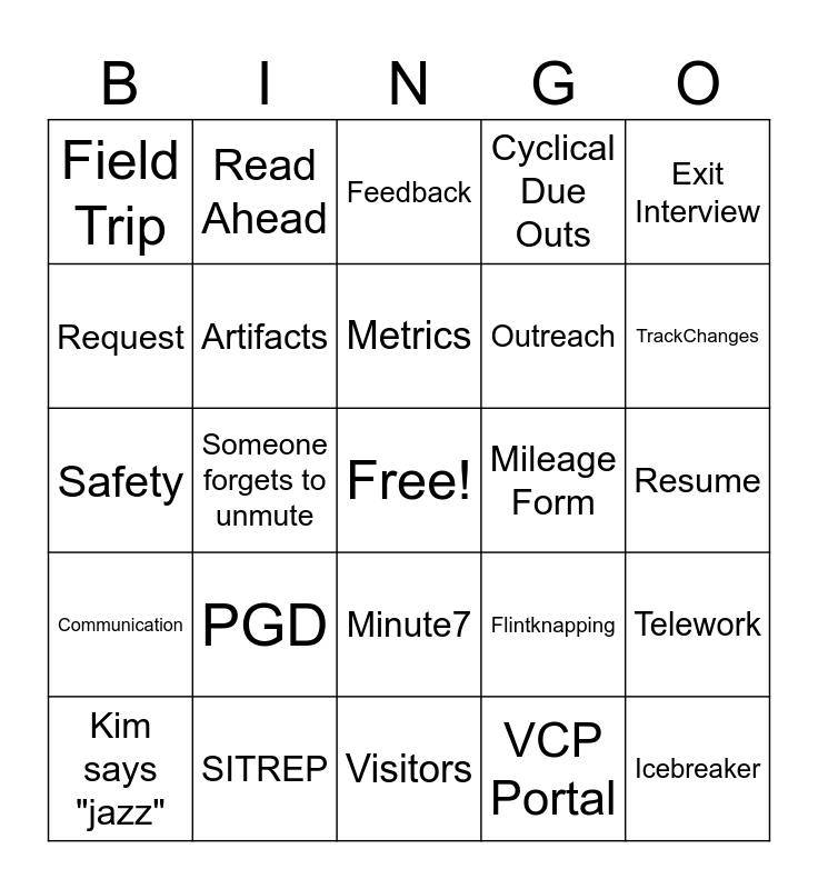 This bingo card has a free space and 24 words: PGD, SITREP, Metrics, Kim says "jazz", Exit Interview, Field Trip, Request, Read Ahead, Mileage Form, Minute7, Outreach, Safety, Flintknapping, Telework, Artifacts, VCP Portal, Resume, Feedback, TrackChanges, Someone forgets to unmute, Icebreaker, Communication, Cyclical Due Outs and Visitors.