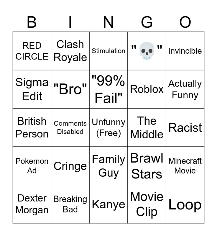 This bingo card has a free space and 24 words: Cringe, Breaking Bad, "99% Fail", Dexter Morgan, Invincible, RED CIRCLE, Sigma Edit, Clash Royale, The Middle, Family Guy, Roblox, British Person, Brawl Stars, Minecraft Movie, "Bro", Movie Clip, Racist, Stimulation, Actually Funny, Comments Disabled, Loop, Pokemon Ad, "💀" and Kanye.