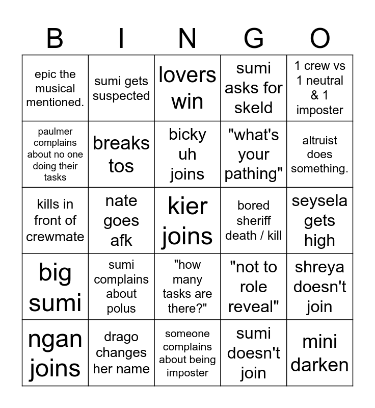 This bingo card has a free space and 24 words: sumi complains about polus, drago changes her name, bicky uh joins, ngan joins, 1 crew vs 1 neutral & 1 imposter, epic the musical mentioned., paulmer complains about no one doing their tasks, sumi gets suspected, bored sheriff death / kill, "how many tasks are there?", "what's your pathing", kills in front of crewmate, "not to role reveal", shreya doesn't join, breaks tos, sumi doesn't join, seysela gets high, lovers win, altruist does something., nate goes afk, mini darken, big sumi, sumi asks for skeld and someone complains about being imposter.