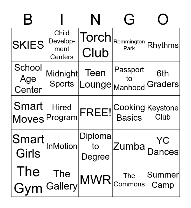 This bingo card has a free space and 24 words: InMotion, The Gallery, Teen Lounge, The Gym, Rhythms, SKIES, School Age Center, Child Develop-ment Centers, Cooking Basics, Diploma to Degree, Passport to Manhood, Smart Moves, Zumba, YC Dances, Midnight Sports, The Commons, Keystone Club, Torch Club, 6th Graders, Hired Program, Summer Camp, Smart Girls, Remmington Park and MWR.
