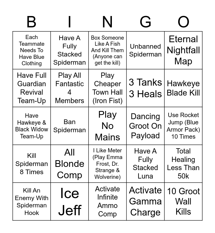 This bingo card has a free space and 24 words: All Blonde Comp, Ice Jeff, Play Cheaper Town Hall (Iron Fist), Kill An Enemy With Spiderman Hook, Eternal Nightfall Map, Each Teammate Needs To Have Blue Clothing, Have Full Guardian Revival Team-Up, Have A Fully Stacked Spiderman, Dancing Groot On Payload, I Like Meter (Play Emma Frost, Dr. Strange & Wolverine), 3 Tanks 3 Heals, Have Hawkeye & Black Widow Team-Up, Have A Fully Stacked Luna, Total Healing Less Than 50k, Play All Fantastic 4 Members, Activate Gamma Charge, Use Rocket Jump (Blue Armor Pack) 10 Times, Box Someone Like A Fish And Kill Them (Anyone can get the kill), Hawkeye Blade Kill, Ban Spiderman, 10 Groot Wall Kills, Kill Spiderman 8 Times, Unbanned Spiderman and Activate Infinite Ammo Comp.
