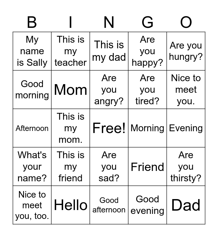 This bingo card has a free space and 24 words: This is my friend, Hello, Are you angry?, Nice to meet you, too., Are you hungry?, My name is Sally, Good morning, This is my teacher, Morning, Are you sad?, Are you tired?, Afternoon, Friend, Are you thirsty?, Mom, Good evening, Evening, This is my dad, Nice to meet you., This is my mom., Dad, What's your name?, Are you happy? and Good afternoon.