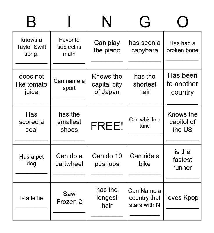 This bingo card has a free space and 34 words: Been on an airplane ________, Can Name a country that stars with N _________, Is the oldest in the family __________, Is the youngest in the family __________, Has a pet dog __________, Can name a sport __________, Has had a broken bone __________, Is a leftie __________, Favorite subject is math __________, Can swim __________, Knows the capital city of Japan _________, Can play the piano _________, Has a summer birthday __________, Went to the Tokyo this year __________, Can whistle a tune ___________, Has been to another country ________, Saw Frozen 2 _________, Has scored a goal _________, Can do a cartwheel _________, Can ride a bike _________, Can do 10 pushups _________, Can sing _________, knows a Taylor Swift song. __________, Knows the capitol of the US _________, has the longest hair _________, loves Kpop _________, has seen a capybara _________, likes rollercoaster _________, has the shortest hair _________, does not like tomato juice _________, Favorite subject is Art. __________, has the smallest shoes _________, is the fastest runner _________ and loves food _______.