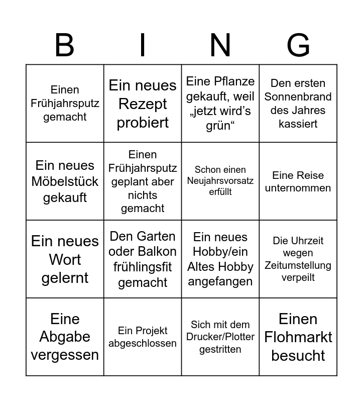 This bingo card has 25 words: Free!, Buch zu Ende gelesen, Eine Reise unternommen, Verwandte besucht, Ein neues Möbelstück gekauft, Einen Frühjahrsputz gemacht, Einen Frühjahrsputz geplant aber nichts gemacht, Ein neues Rezept probiert, Ein Projekt abgeschlossen, Einen neuen Befehlt (AutoCAD,Revit) gelernt, Ein neues Wort gelernt, Ein neues Hobby/ein Altes Hobby angefangen, Einen Botanischen Garten besucht, Sport gemacht, Schon einen Neujahrsvorsatz erfüllt, Ein Programm geschlossen, ohne zu speichern, Sich mit dem Drucker/Plotter gestritten, Eine Pflanze gekauft, weil „jetzt wird’s grün“, Den Garten oder Balkon frühlingsfit gemacht, Die Uhrzeit wegen Zeitumstellung verpeilt, Eine Abgabe vergessen, Für jemand anderes den PC repariert (aka neugestartet), Einen Flohmarkt besucht, Den ersten Sonnenbrand des Jahres kassiert and Ein E-Learning gemacht.