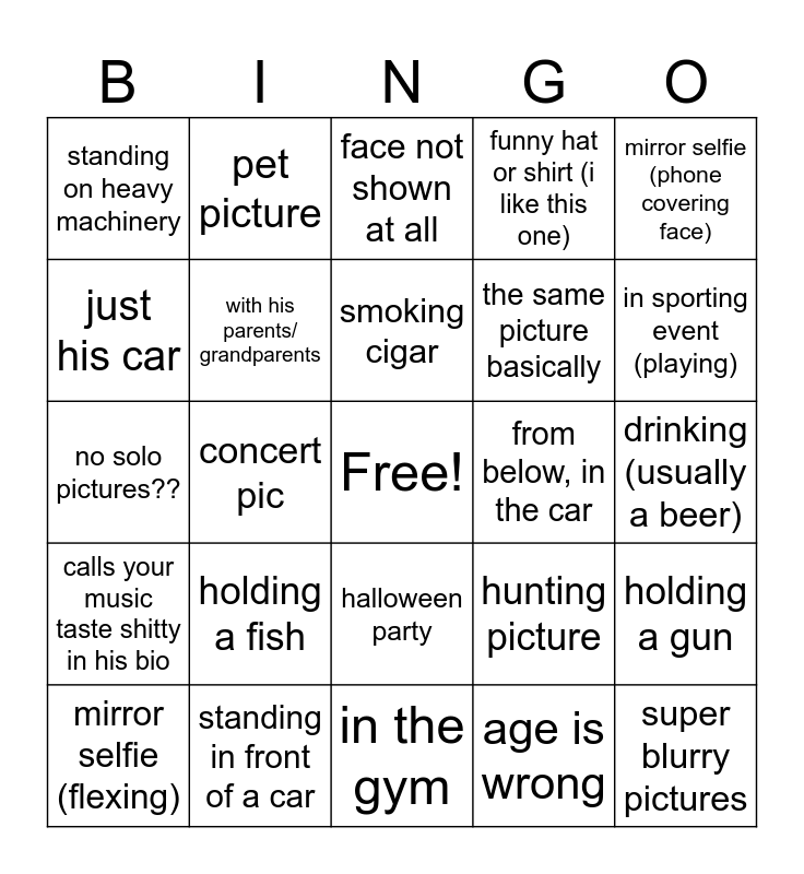 This bingo card has a free space and 24 words: holding a fish, standing in front of a car, smoking cigar, mirror selfie (flexing), mirror selfie (phone covering face), standing on heavy machinery, just his car, pet picture, from below, in the car, halloween party, the same picture basically, no solo pictures??, hunting picture, holding a gun, with his parents/ grandparents, age is wrong, drinking (usually a beer), face not shown at all, in sporting event (playing), concert pic, super blurry pictures, calls your music taste shitty in his bio, funny hat or shirt (i like this one) and in the gym.