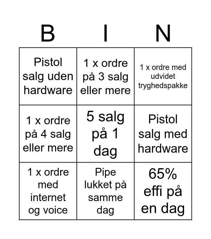 This bingo card has a free space and 8 words: Pistol salg med hardware, 1 x ordre med udvidet tryghedspakke, 1 x ordre på 3 salg eller mere, 1 x ordre med internet og voice, Pistol salg uden hardware, 65% effi på en dag, 1 x ordre på 4 salg eller mere and Pipe lukket på samme dag.