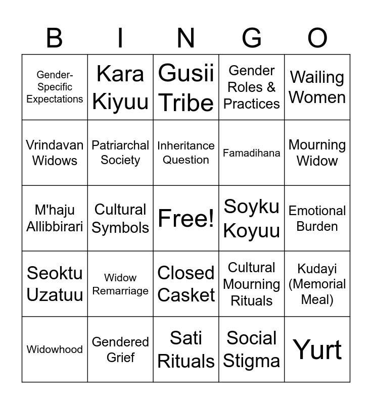 This bingo card has a free space and 27 words: Cultural Mourning Rituals, Tibetan Sky Burial, Famadihana, Sati Rituals, Vrindavan Widows, Gusii Tribe, Kara Kiyuu, Seoktu Uzatuu, Soyku Koyuu, Kudayi (Memorial Meal), M'haju Allibbirari, Gender Roles & Practices, Widowhood, Gendered Grief, Mourning Widow, Ululations, Patriarchal Society, Inheritance Question, Widow Remarriage, Gender-Specific Expectations, Emotional Burden, Social Stigma, Cultural Symbols, Yurt, Closed Casket, Wailing Women and Burial Stretcher.
