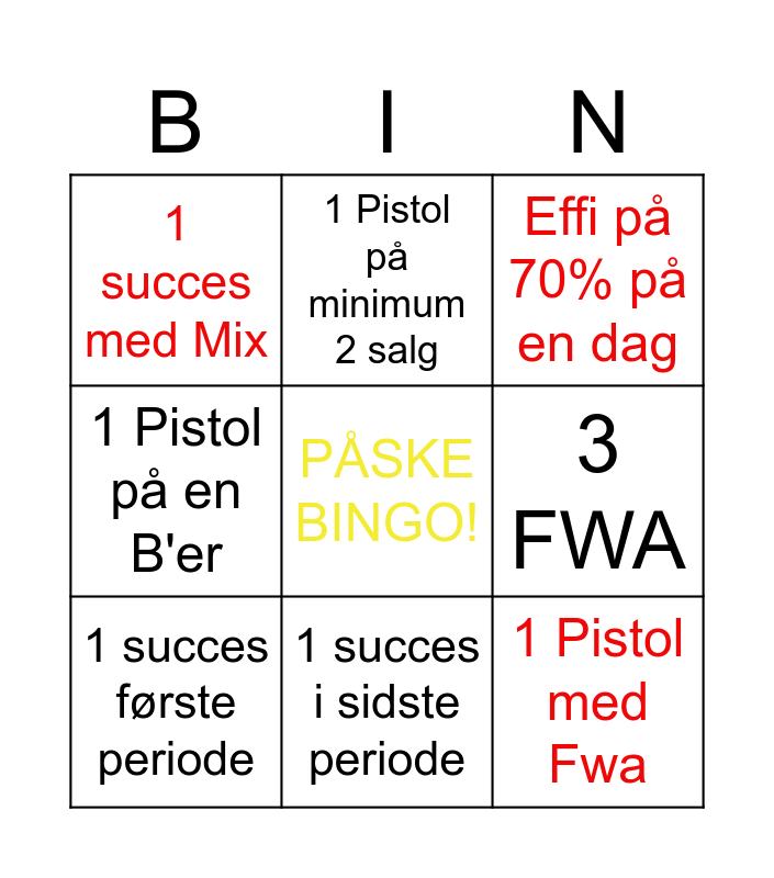 This bingo card has a free space and 8 words: 3 FWA, Effi på 70% på en dag, 1 Pistol på minimum 2 salg, 1 succes første periode, 1 succes med Mix, 1 Pistol med Fwa, 1 Pistol på en B'er and 1 succes i sidste periode.