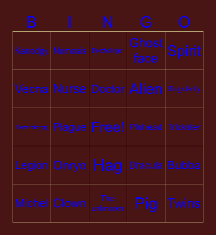 This bingo card has a free space and 39 words: Trapper, Wraith, Billy, Nurse, Michel, Hag, Doctor, Huntress, Spirit, Legion, Plague, Ghost face, Twins, Trickster, Pinhead, Onryo, Chucky, Kanedgy, Houndmaster, Dracula, Vecna, The unknown, Alien, Singularity, Skull merchant, Knight, Wesker, Dredge, Arist, Nemesis, Blight, Primid head, Deathslinger, Clown, Pig, Freddy, Bubba, Demodoggy and Oni.