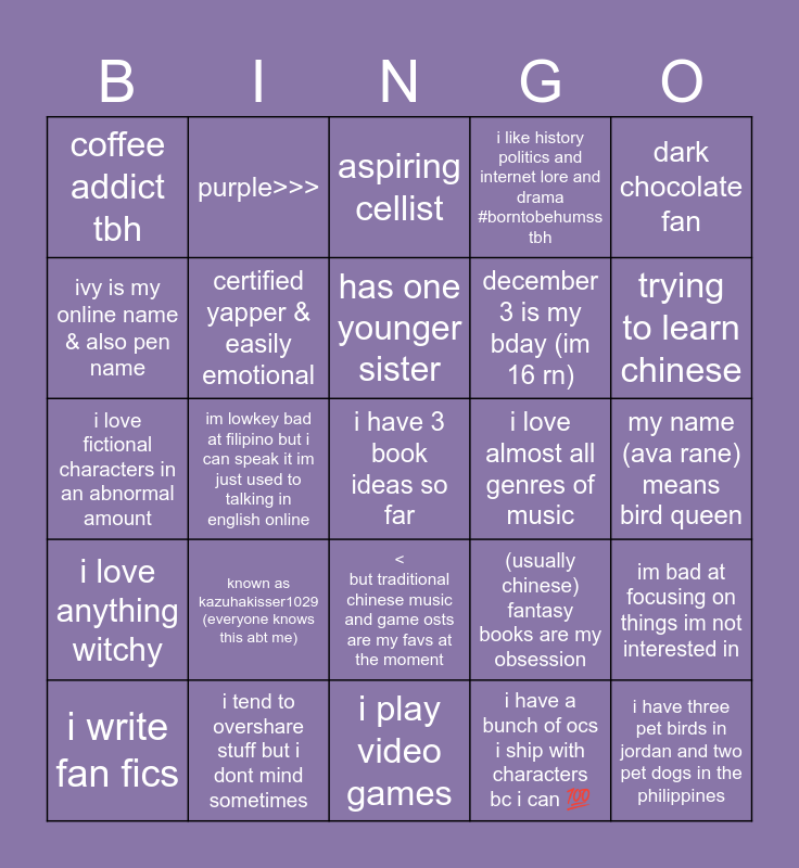 This bingo card has 25 words: known as kazuhakisser1029 (everyone knows this abt me), i play video games, has one younger sister, i write fan fics, dark chocolate fan, coffee addict tbh, ivy is my online name & also pen name, purple>>>, i love almost all genres of music, < but traditional chinese music and game osts are my favs at the moment, december 3 is my bday (im 16 rn), i love fictional characters in an abnormal amount, (usually chinese) fantasy books are my obsession, im bad at focusing on things im not interested in, certified yapper & easily emotional, i have three pet birds in jordan and two pet dogs in the philippines, my name (ava rane) means bird queen, aspiring cellist, trying to learn chinese, im lowkey bad at filipino but i can speak it im just used to talking in english online, i have 3 book ideas so far, i tend to overshare stuff but i dont mind sometimes, i love anything witchy, i like history politics and internet lore and drama #borntobehumss tbh and i have a bunch of ocs i ship with characters bc i can 💯.