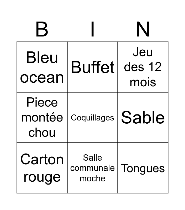This bingo card has a free space and 8 words: Sable, Jeu des 12 mois, Buffet, Carton rouge, Bleu ocean, Tongues, Piece montée chou and Salle communale moche.