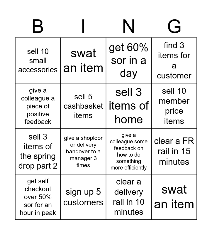 This bingo card has 16 words: sign up 5 customers, clear a FR rail in 15 minutes, get 60% sor in a day, sell 10 small accessories, sell 3 items of the spring drop part 2, swat an item, give a colleague some feedback on how to do something more efficiently, clear a delivery rail in 10 minutes, give a colleague a piece of positive feedback, sell 5 cashbasket items, get self checkout over 50% sor for an hour in peak, find 3 items for a customer, give a shoploor or delivery handover to a manager 3 times, sell 10 member price items, sell 3 items of home and swat an item.