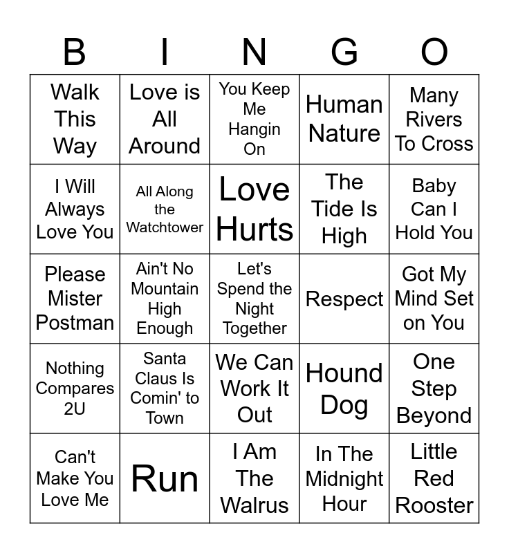This bingo card has 47 words: Free!, Let's Spend the Night Together, Come Together, I Am The Walrus, Santa Claus Is Comin' to Town, BLACKBIRD, Love is All Around, Ballad of a Thin Man, I Will Always Love You, Knockin' On Heaven's Door, All Along the Watchtower, Human Nature, One Step Beyond, Hound Dog, Shout, Will You Still Love Me Tomorrow?, Love Hurts, Respect, The First Cut Is the Deepest, Many Rivers To Cross, Ain't No Mountain High Enough, In The Midnight Hour, Walk This Way, The Tide Is High, A New England, Baby Can I Hold You, Can't Make You Love Me, Can't Take My Eyes Off of You, We Can Work It Out, Nothing Compares 2U, With A Little Help From My Friends, If You Don't Know Me by Now, Hit the Road Jack, I Shot The Sheriff, Baby, I Love You, Run, Got My Mind Set on You, Hurt, The Man Who Sold The World, Proud Mary, Little Red Rooster, You Keep Me Hangin On, Please Mister Postman, Stand by Me, Tainted Love, Caravan Of Love and Dancing On My Own.