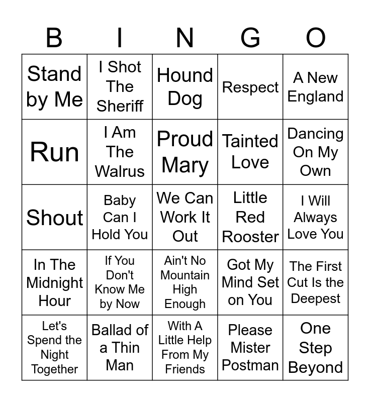 This bingo card has 47 words: Free!, We Can Work It Out, Nothing Compares 2U, With A Little Help From My Friends, If You Don't Know Me by Now, Hit the Road Jack, I Shot The Sheriff, Baby, I Love You, Run, Come Together, I Am The Walrus, Respect, The First Cut Is the Deepest, Got My Mind Set on You, Hurt, The Man Who Sold The World, Proud Mary, Little Red Rooster, You Keep Me Hangin On, A New England, Baby Can I Hold You, Please Mister Postman, Stand by Me, Tainted Love, Caravan Of Love, Dancing On My Own, Let's Spend the Night Together, Many Rivers To Cross, Ain't No Mountain High Enough, In The Midnight Hour, Walk This Way, The Tide Is High, Santa Claus Is Comin' to Town, BLACKBIRD, Love is All Around, Ballad of a Thin Man, I Will Always Love You, Knockin' On Heaven's Door, All Along the Watchtower, Human Nature, One Step Beyond, Hound Dog, Shout, Will You Still Love Me Tomorrow?, Love Hurts, Can't Make You Love Me and Can't Take My Eyes Off of You.