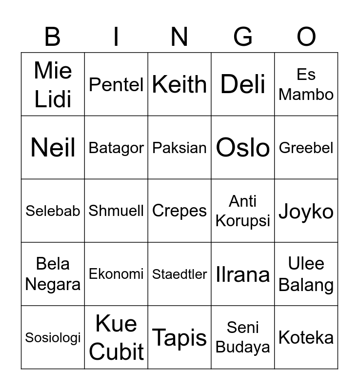 This bingo card has a free space and 24 words: Ekonomi, Kue Cubit, Paksian, Sosiologi, Es Mambo, Mie Lidi, Neil, Pentel, Anti Korupsi, Staedtler, Oslo, Selebab, Ilrana, Ulee Balang, Batagor, Seni Budaya, Joyko, Keith, Greebel, Shmuell, Koteka, Bela Negara, Deli and Tapis.
