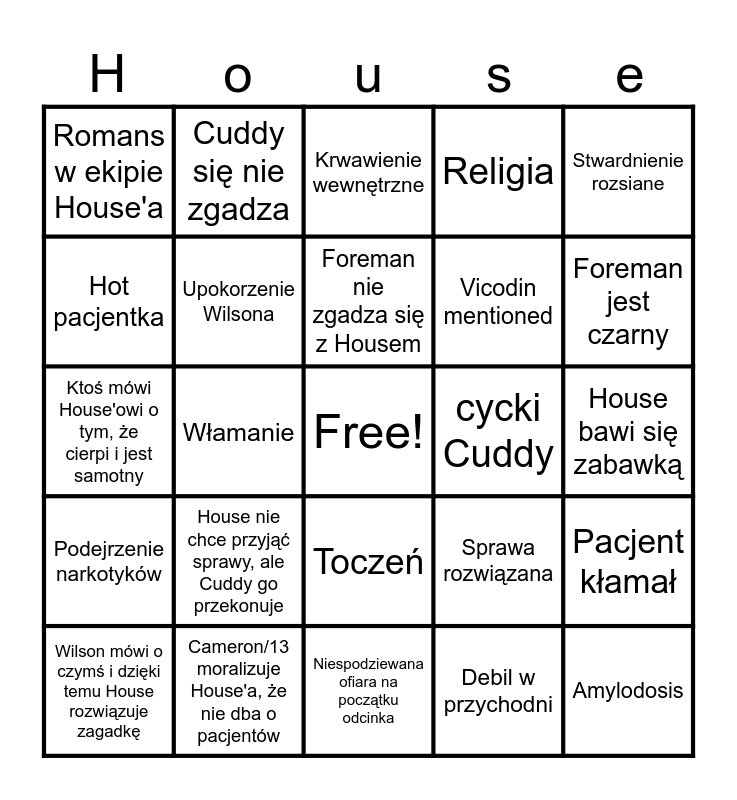 This bingo card has a free space and 24 words: House nie chce przyjąć sprawy, ale Cuddy go przekonuje, Cameron/13 moralizuje House'a, że nie dba o pacjentów, Foreman nie zgadza się z Housem, Wilson mówi o czymś i dzięki temu House rozwiązuje zagadkę, Stwardnienie rozsiane, Romans w ekipie House'a, Hot pacjentka, Cuddy się nie zgadza, cycki Cuddy, Toczeń, Vicodin mentioned, Ktoś mówi House'owi o tym, że cierpi i jest samotny, Sprawa rozwiązana, Pacjent kłamał, Upokorzenie Wilsona, Debil w przychodni, House bawi się zabawką, Krwawienie wewnętrzne, Foreman jest czarny, Włamanie, Amylodosis, Podejrzenie narkotyków, Religia and Niespodziewana ofiara na początku odcinka.