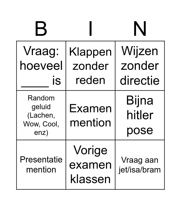 This bingo card has a free space and 8 words: Bijna hitler pose, Wijzen zonder directie, Klappen zonder reden, Presentatie mention, Vraag: hoeveel ____ is, Vraag aan jet/isa/bram, Random geluid (Lachen, Wow, Cool, enz) and Vorige examen klassen.
