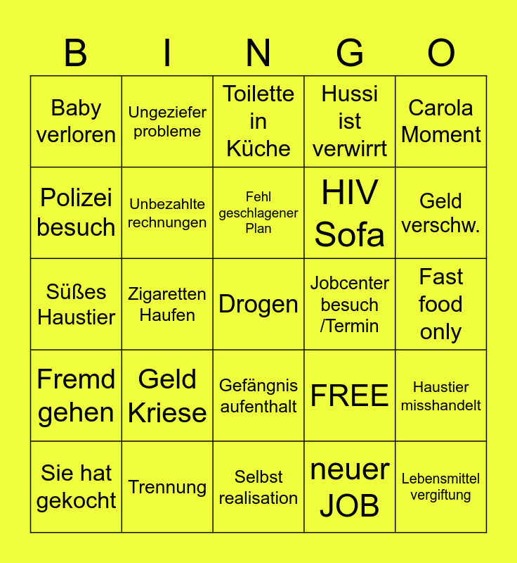 This bingo card has 25 words: Geld Kriese, Selbst realisation, Fehl geschlagener Plan, Sie hat gekocht, Carola Moment, Baby verloren, Polizei besuch, Ungeziefer probleme, Jobcenter besuch /Termin, Gefängnis aufenthalt, HIV Sofa, Süßes Haustier, FREE, Haustier misshandelt, Unbezahlte rechnungen, Lebensmittel vergiftung, Fast food only, Toilette in Küche, Geld verschw., Zigaretten Haufen, Drogen, Trennung, Fremd gehen, Hussi ist verwirrt and neuer JOB.