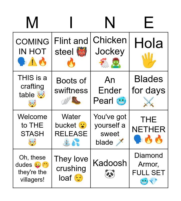 This bingo card has 20 words: THE NETHER 🗣🔥🔥, I AM STEVE 🗣🔥🔥, Chicken Jockey 🐔🧟♂️, Big ol' red ones 🍄🍄, Oh, these dudes 😜🤭 they're the villagers!, THIS is a crafting table 🤯🤯, They love crushing loaf 😌, COMING IN HOT 🗣⚠️🔥, Welcome to THE STASH 🤯, Flint and steel 👹🔥, Water bucket 😮 RELEASE ⛲️💦, You've got yourself a sweet blade 🗡, Boots of swiftness 🪽🥾, Diamond Armor, FULL SET 🥶💎, An Ender Pearl 🥶, As a child I yearned for the mines 🗿, Blades for days ⚔️, Hola 🖐, Kadoosh 🐼 and Hot lava and chicken ⁉️.