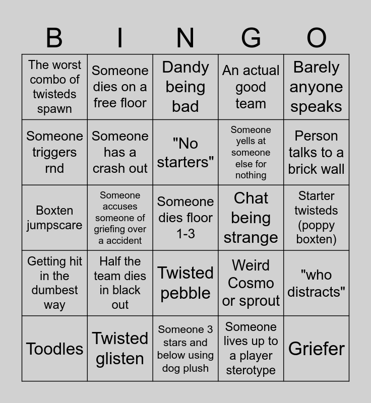 This bingo card has 50 words: Half of the lobby leaves, Someone dies floor 1-3, Sprout or someone yells at someone for taking a tape, Someone 3 stars and below using dog plush, Half the team dies in black out, Entitled cosmos, Someone dies on a free floor, Someone opens rodger, Someone triggers rnd, Main rage quitting, Someone has a crash out, An actual good team, "who distracts", Weird Cosmo or sprout, 3 or more people surviving to floor 15, The wildest trinkets ever, "No starters", Chat being strange, "may I?" When someone's on a machine, Barely anyone speaks, Someone accuses someone of griefing over a accident, Someone lives up to a player sterotype, The worst combo of twisteds spawn, Someone yells at someone else for nothing, Someone swaps to shrimpo, Griefer, Person talks to a brick wall, Dandy being good, Dandy being bad, Twisted pebble, Twisted goob, Twisted scraps, Twisted gigi, Twisted flutter, Twisted glisten, Twisted shelly, Twisted vee, Twisted Sprout, Twisted astro, Starter twisteds (poppy boxten), Someone goes afk, A what are you doing moment, Asking for heal, Roleplayer, Toodles, Boxten jumpscare, Someone lags to death, Every twisted is on you, Getting hit in the dumbest way and Someone has veemote.