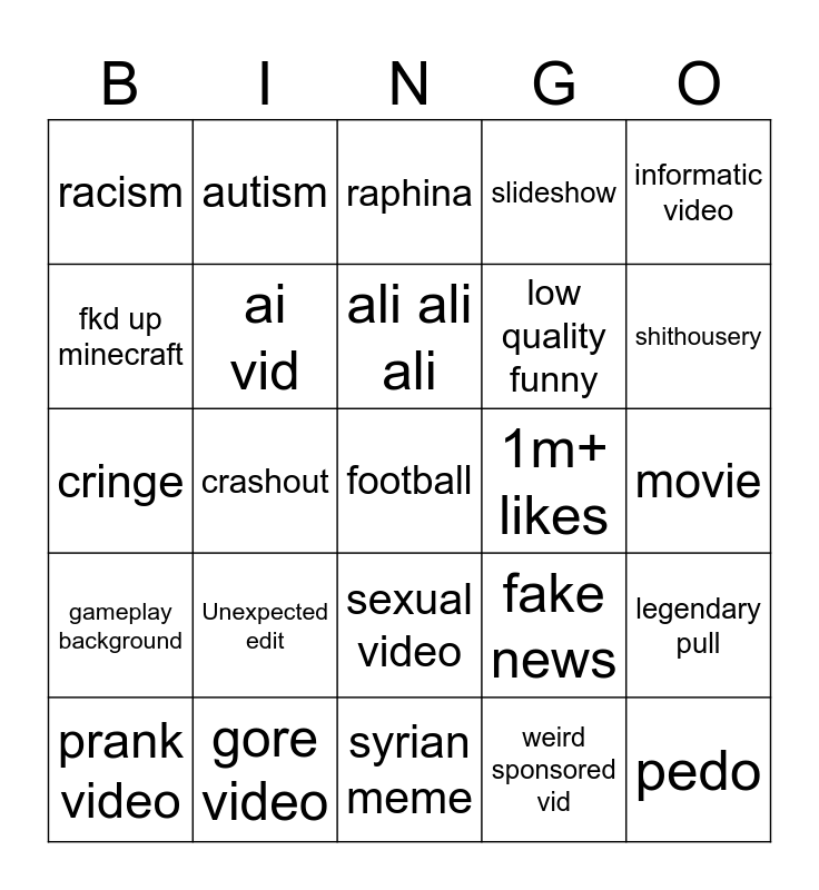 This bingo card has a free space and 24 words: Unexpected edit, gore video, ali ali ali, prank video, informatic video, racism, fkd up minecraft, autism, 1m+ likes, sexual video, low quality funny, cringe, fake news, legendary pull, ai vid, weird sponsored vid, movie, raphina, shithousery, crashout, pedo, gameplay background, slideshow and syrian meme.